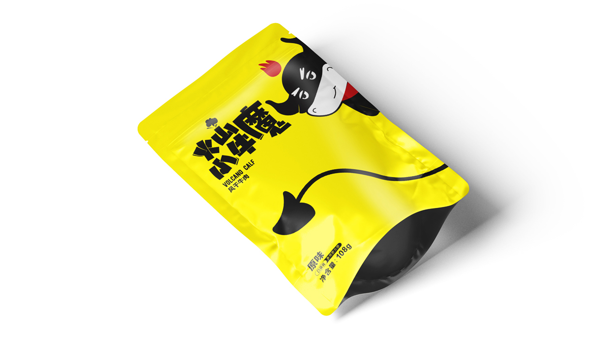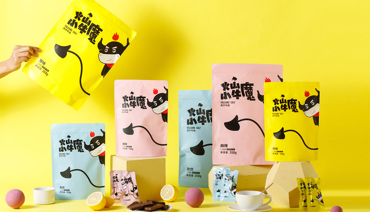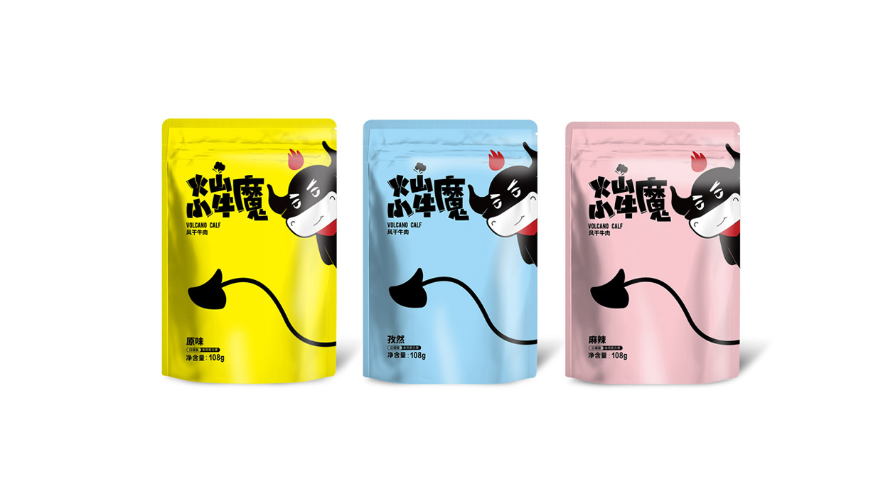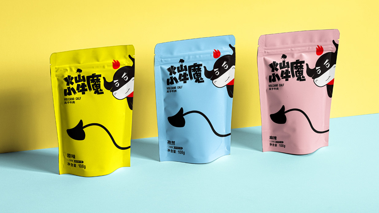 Introduction:火山小牛魔是一個(gè)牛肉干的品牌,名稱直觀來看,腦海里第一出現(xiàn)的應(yīng)該是小小Q版牛魔王的造型。有點(diǎn)呆/有點(diǎn)搞怪的性格,考慮到品牌的傳播性,知物設(shè)計(jì)在造型上盡可能簡約,色彩醒目,更加有利于傳播和記憶。
