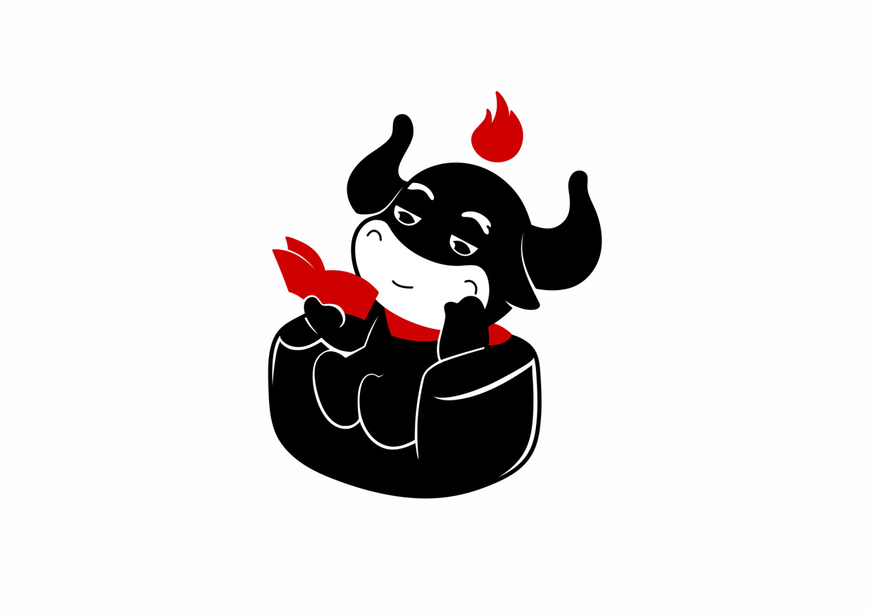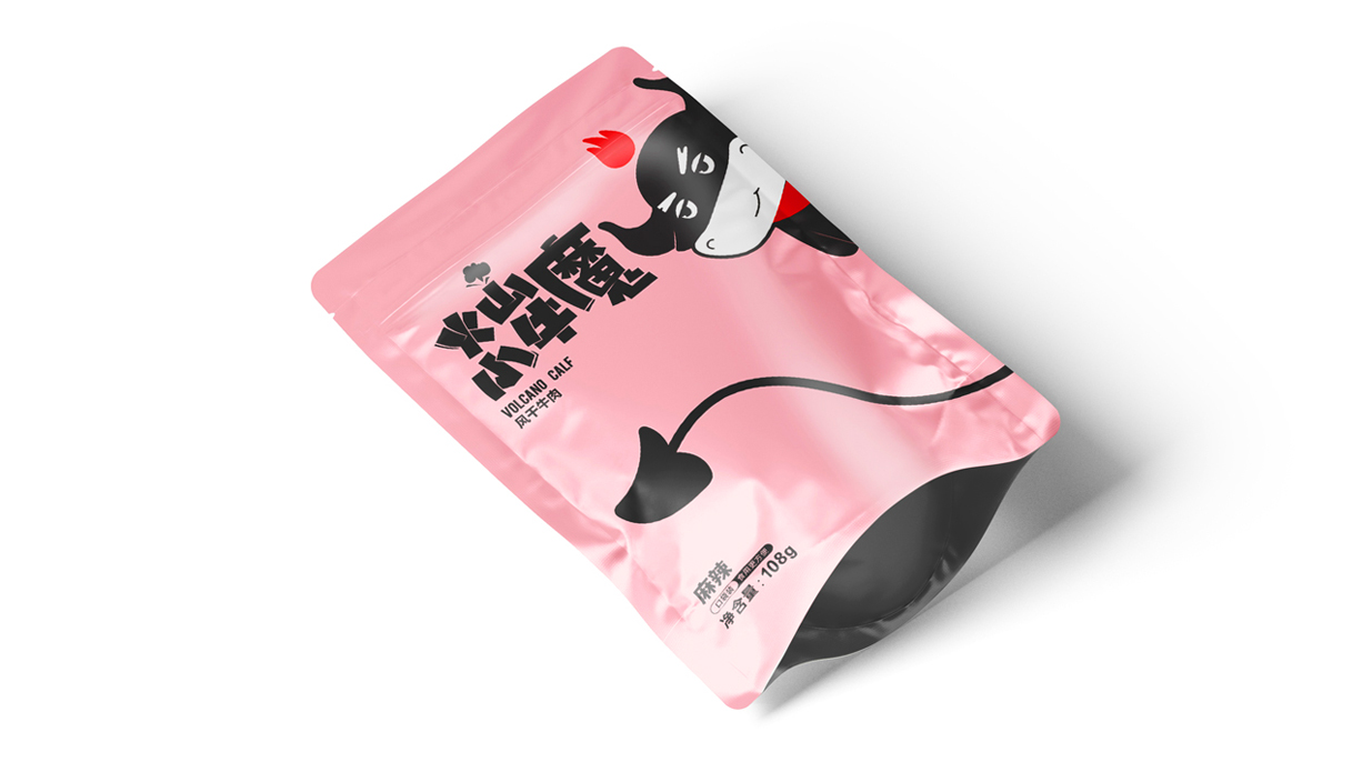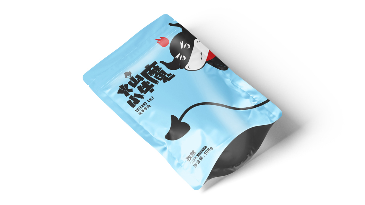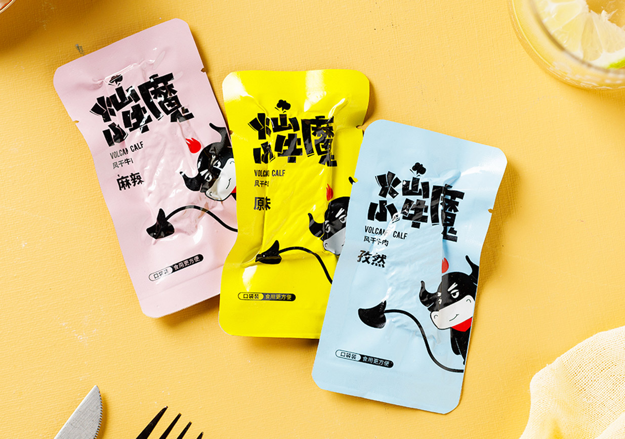 Introduction:火山小牛魔是一個(gè)牛肉干的品牌,名稱直觀來看,腦海里第一出現(xiàn)的應(yīng)該是小小Q版牛魔王的造型。有點(diǎn)呆/有點(diǎn)搞怪的性格,考慮到品牌的傳播性,知物設(shè)計(jì)在造型上盡可能簡約,色彩醒目,更加有利于傳播和記憶。