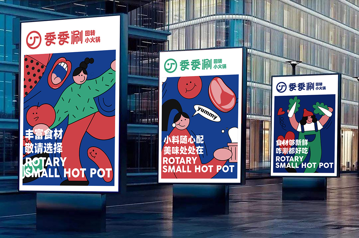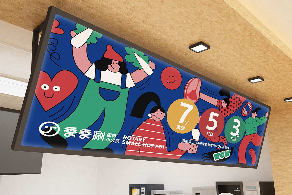 整體設(shè)計(jì)風(fēng)格簡(jiǎn)約而精致,以扁平化的插畫(huà)形式描繪出輕松愉悅的用餐場(chǎng)景,吸引年輕消費(fèi)者的目光。這種設(shè)計(jì)風(fēng)格旨在滿足讓消費(fèi)者在享受美食的同時(shí),也能感受到季季涮對(duì)美食的熱愛(ài)和對(duì)生活的熱情融入其中,我們相信季季涮回轉(zhuǎn)小火鍋能成為年輕消費(fèi)者心中的美食天堂。在這里,他們可以盡情享受新鮮美味的食物,隨心所欲地涮出自己喜歡的味道。